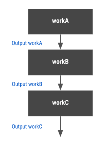 Giả sử ứng dụng của bạn có ba đối tượng OneTimeWorkRequest: workA, workB và workC như hình trên. Các nhiệm vụ phải được chạy theo thứ tự đó. Để enqueue chúng, tạo một chuỗi với phương thức WorkManager.beginWith (), truyền đối tượng OneTimeWorkRequest đầu tiên; phương thức đó trả về một đối tượng WorkContinuation, nó định nghĩa một chuỗi các nhiệm vụ. Sau đó, thêm các đối tượng OneTimeWorkRequest còn lại, theo thứ tự, với WorkContinuation.then (), và cuối cùng, enqueue toàn bộ chuỗi với WorkContinuation.enqueue():
