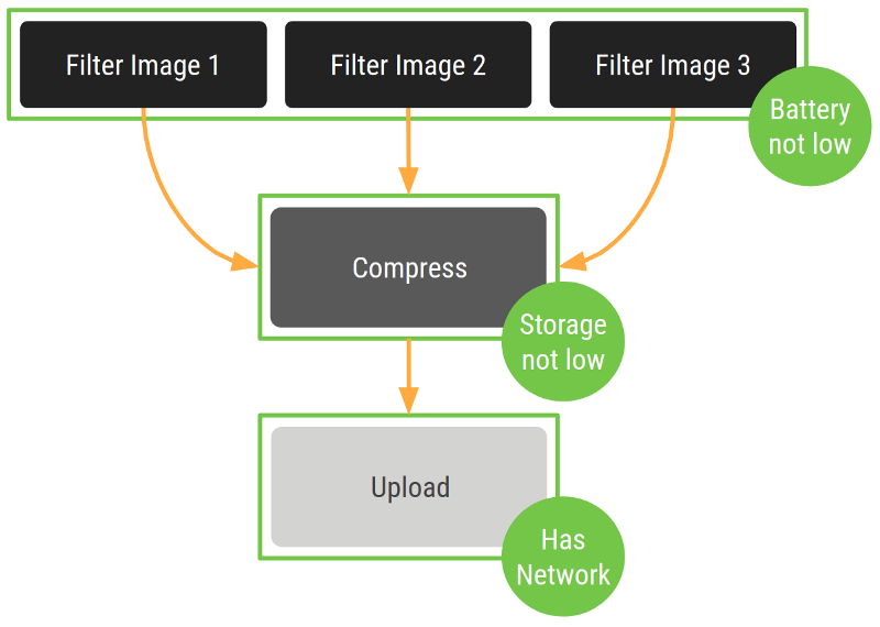Giả sử chúng ta đang code task yêu cầu thực hiện chuỗi công việc theo thứ tự filter image khi pin thiết bị chưa cạn -> nén ảnh khi bộ nhớ lưu trữ còn trống -> upload ảnh khi có kết nối mạng (như hình trên) và đảm bảo tiến trình vẫn thực hiện khi người dùng đã thoát ứng dụng. Để giải bài toán này, tất nhiên chúng ta cần phải xử lý ở background vì nó là task cần nhiều thời gian để xử lý. Trong Android, chúng ta có nhiều cách để xử lý task ở background. Đó là: