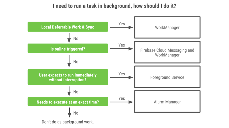 Như đã giải thích ở đoạn trên (mục I. 2.) kèm với sơ đồ trên, chúng ta có thể thấy không phải lúc nào cũng phải sử dụng WorkManager để xử lý các task ở background. Có thể sử dụng ForegroundService, AlarmManager hay ThreadPool để xử lý.