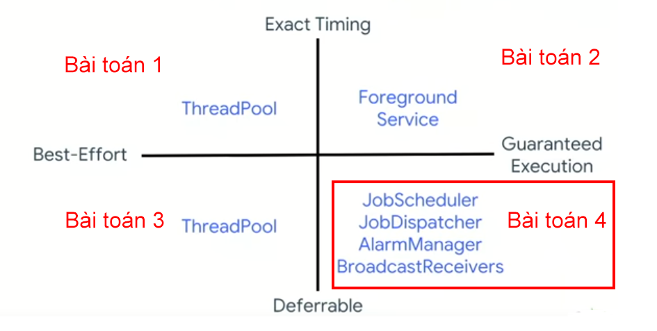 Guaranteed Execution là đảm bảo hệ thống sẽ chạy những đoạn code này ngay cả khi ứng dụng đã bị thoát. Còn nếu task nào mà không cần chạy tiếp khi thoát app (ví dụ như bài toán 1 và bài toán 3 như hình trên) thì không cần phải xử dụng WorkManager. Còn những task nào yêu cầu chạy ngay lập tức (ngay sau khi user click chẳng hạn) và tiếp tục chạy ngay cả khi ứng dụng đã bị thoát (như yêu cầu của bài toán 2) thì có thể cân nhắc sử dụng Foreground Service