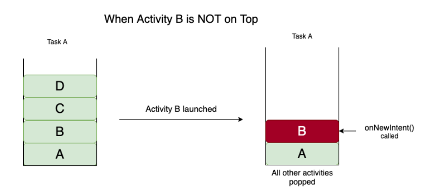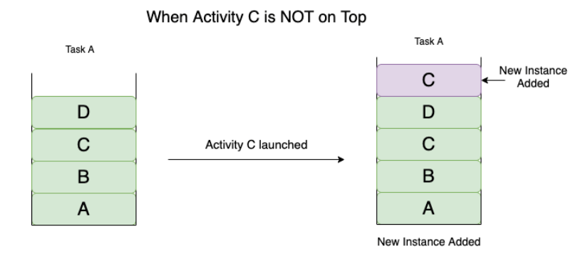 Trường hợp nếu activity được gọi đến đang không nằm ở top của task hiện tại thì một instance của activity đó sẽ được tạo ra và nằm trên top của task hiện tại.