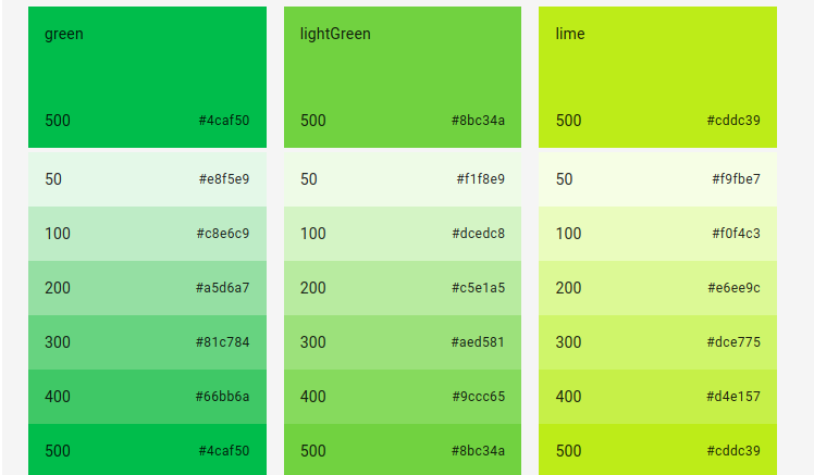 Bảng màu của Material Design chứa các màu sắc để lựa chọn, mỗi loài màu có một màu chính và các sắc thái được dán nhãn từ 50 đến 900