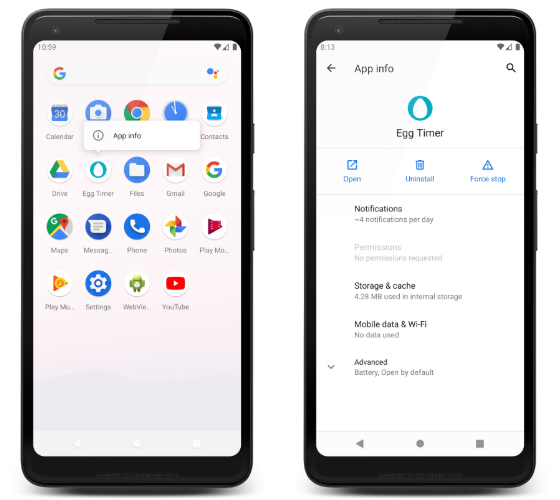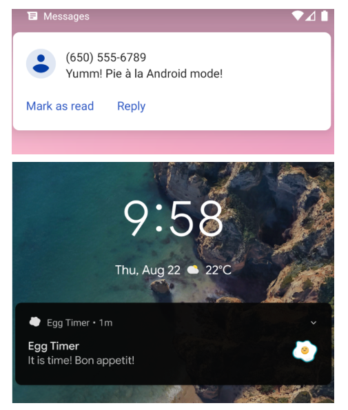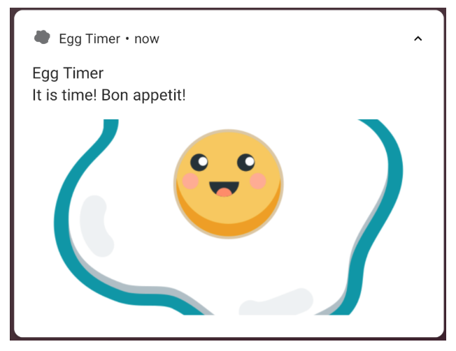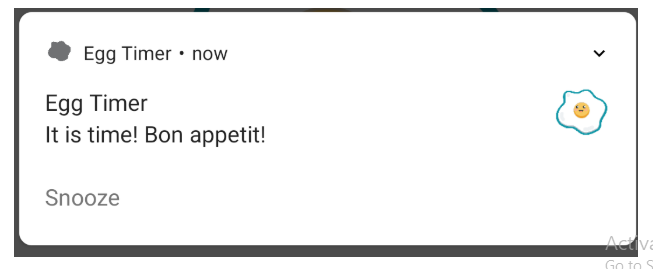 Tốt nhất Egg Timer nên sử dụng Notification để báo cho người dùng khi hết thời gian. Người dùng sẽ biết trứng đã chín và sẵn sàng ngay lập tức, nêu không trứng sẽ không chín quá. Notification rất trực quan, có thể bao gồm âm thanh, có thể làm cho điện thoại rung và thu hút người dùng.