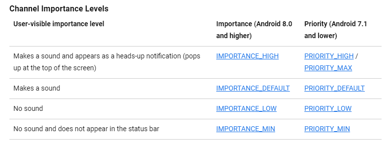 Tùy vào mức độ quan trọng mà Notification có thể làm gián đoạn người dùng một cách trực quan và rõ ràng. Có 5 mức, từ IMPORTANCE_NONE(0) đến IMPORTANCE_HIGHT(4)