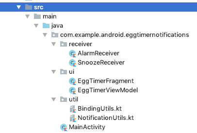 - ui package chứa EggTimerFragment là một phần giao diện của ứng dụng. EggTimerViewModel chịu trách nhiệm start và huỷ các vòng đời của bộ hẹn giờ.