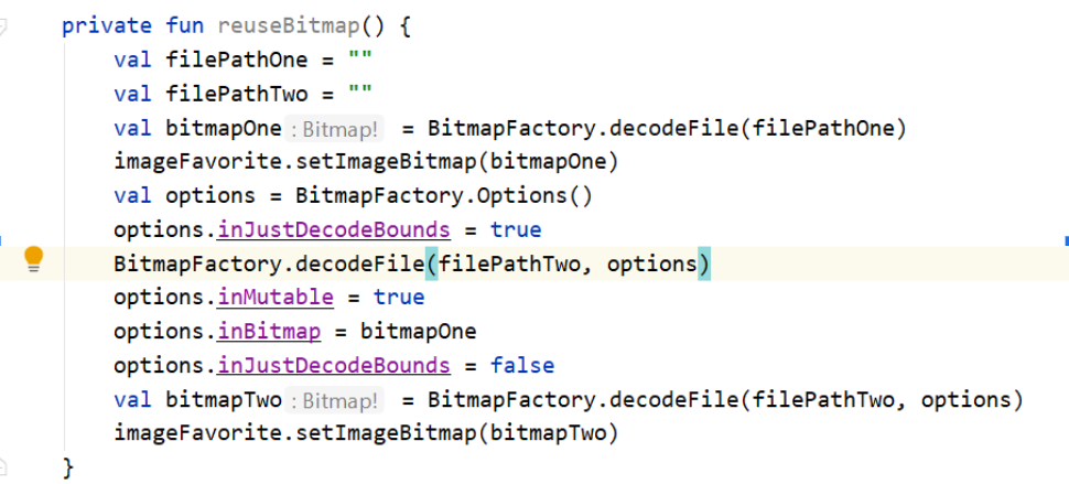 Trong đoạn code trên bạn có thể thấy bitmapOne được tạo ra trước đó. Khi bitmapTwo được tạo ra sẽ sử dụng option được định nghĩa dựa trên bitmapOne để khởi tạo và tái sử dụng. Phương thức inJustDecodeBounds = true khai báo để thông báo với chương trình không khởi tạo 1 vùng nhớ mới khi bitmapTwo được tạo ra và từ đó vùng nhớ bitmapOne có thể được tái sử dụng. Thật tuyệt vời phải không nào