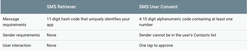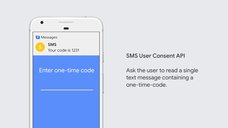 https://developers.google.com/identity/sms-retriever/choose-an-api https://developers.google.com/identity/sms-retriever/user-consent/overview https://medium.com/androiddevelopers/automatic-sms-verification-with-sms-user-consent-da8c16135e25