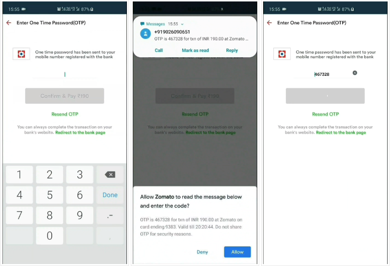 Khi sử dụng SMS User Consent API để tự động điền mã OTP, người dùng sẽ được nhắc cho phép ứng dụng của bạn có quyền đọc một tin nhắn SMS. Người dùng sẽ thấy các màn hình sau