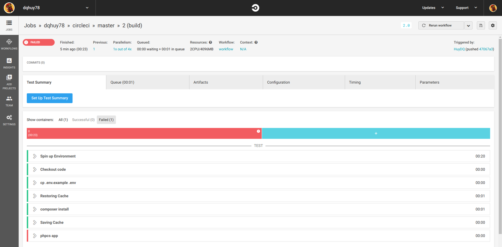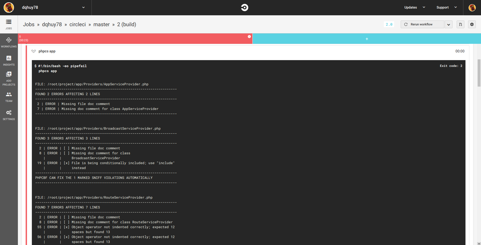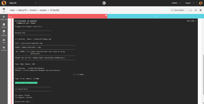 Nếu bản build của bạn success thì sẽ trả về kết quả như ảnh trên đồng thời hiển thị các command success như bạn khai báo trong file. Giờ chúng ta sẽ thử lại với trường hơp phpcs fail xem nó có chạy phpunit hay không bằng cách bạn thêm vài lỗi convention vào folder app của mình. Đây là kết quả: