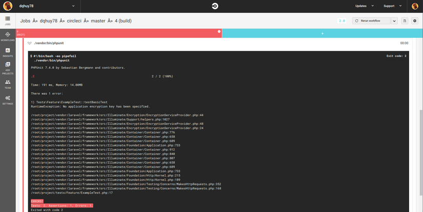 Tuy nhiên lần này phpcs của chúng ta vẫn pass như bình thường còn unit-test lại bị fail. Chúng ta có thể mở tab chạy lệnh ./vendor/bint/phpunit để xem thông tin lỗi và sửa nó. Ở đây có vẻ do mình thiếu lệnh tạo key cho file .env dẫn tới bản build bị lỗi. Chúng ta có thể sửa nó lại bằng cách thêm lệnh sinh key cho file config.yml như sau: