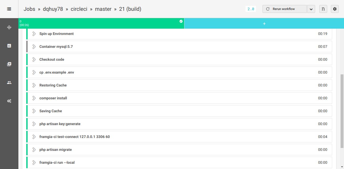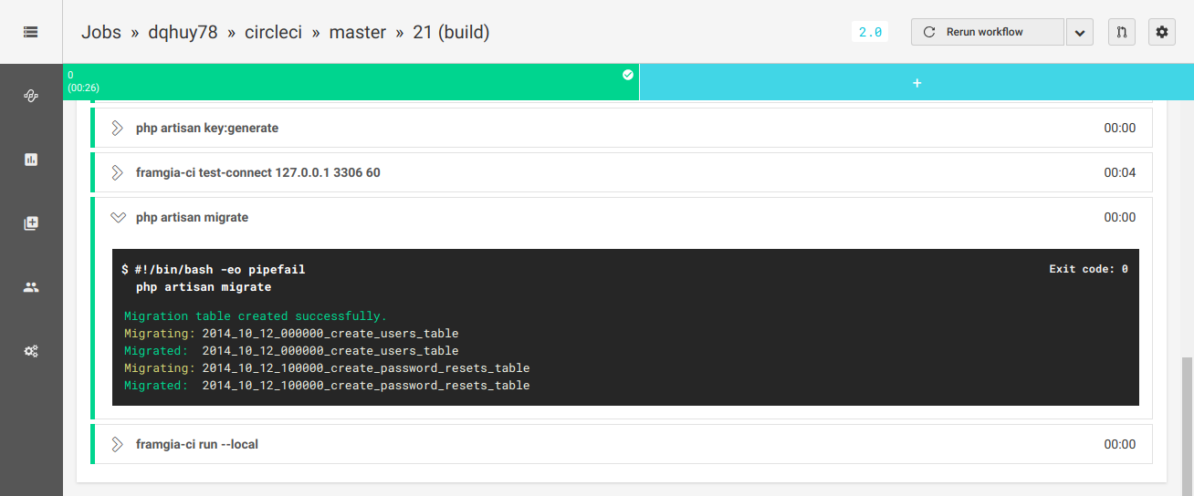 Bạn có thể thấy có thêm phần Container mysql:5.7 là khối chứa dữ thông tin về việc tạo container cho database của chúng ta cùng với 2 lệnh là framgia-ci test-connect 127.0.0.1 3306 60 và php artisan migrate mà chúng ta mới thêm vào. Thử mở mục php artisan migrate ta sẽ thấy việc migrate database đã thành công:
