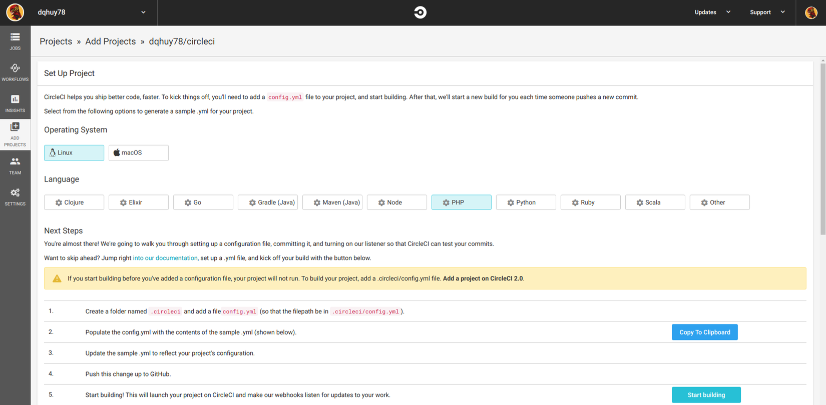 Sau khi chọn Set Up Project sẽ hiện ra một màn hình mới và bạn lần lượt chọn OS là Linux, Language là PHP và cuối cùng bấm Start building để tiến hành build thử lần đầu tiên: