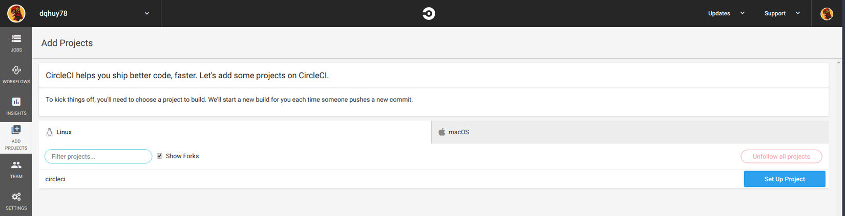 Sau khi đã thêm file config cho CircleCI, ta sẽ tiến hành truy cập vào trang web https://circleci.com và tiến hành đăng nhập với Github. Sau khi đã đăng nhập, bạn chọn mục Add project sau đó chọn project bạn vừa config và bấm Set Up Project: