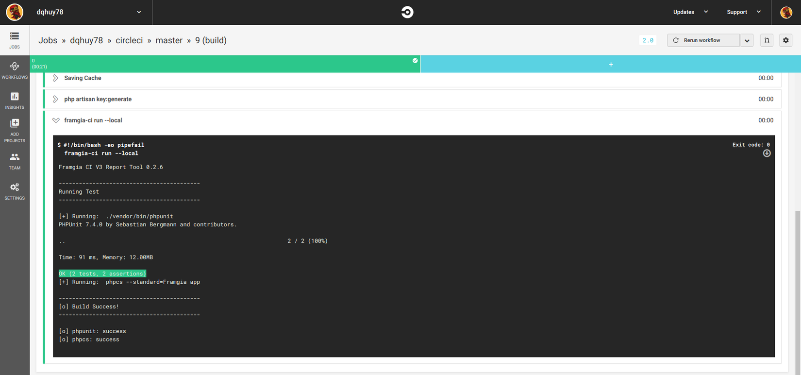 Lúc này bản build của chúng ta đã success đồng nghĩa với việc pass các yêu cầu về convention mà ta đặt ra. Tuy nhiên trong project thường chúng ta sẽ có cả phần unit-test nên chúng ta sẽ tiến hành thêm lệnh chạy unit-test của Laravel vào file config.yml như sau: