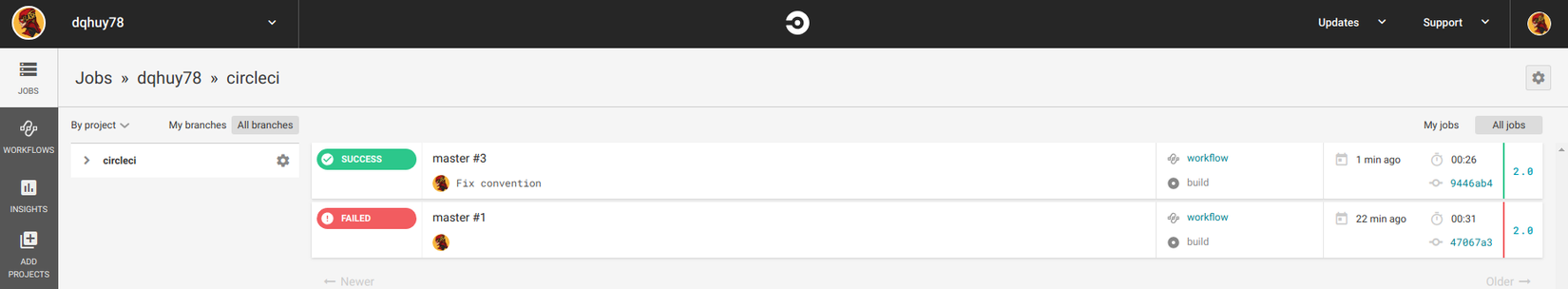 Như vậy là về cơ bản, project của chúng ta đã chạy được trên CircleCI, giờ đây với mỗi push/pull request đến repository này của chúng ta sẽ tạo ra một bạn build tương ứng kiểm tra convention của code mới. Trước khi thử đẩy pull mới, mình sẽ sửa lại lệnh chạy phpcs thành tiêu chuẩn convention mà mình hay dùng (đã được cài sẵn trong docker image ở trên) và sửa các lỗi phát sinh. Đây là kết quả sau khi chúng ta đã sửa lỗi convention và đẩy lại lên: