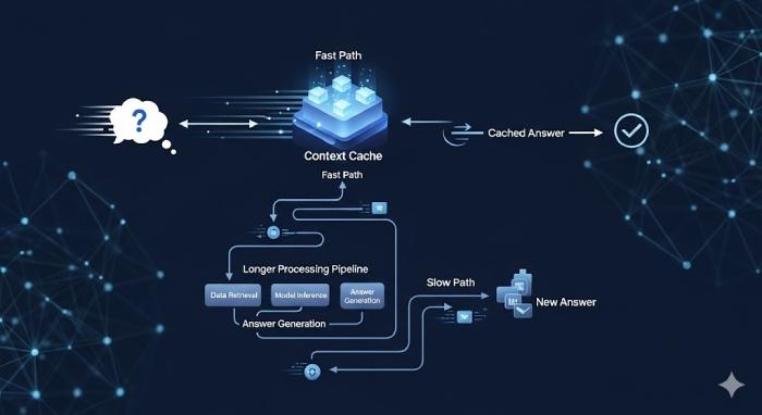 Hiểu đơn giản, context caching hoạt động như một bộ nhớ đệm trung gian. Khi người dùng gửi câu hỏi, hệ thống sẽ: