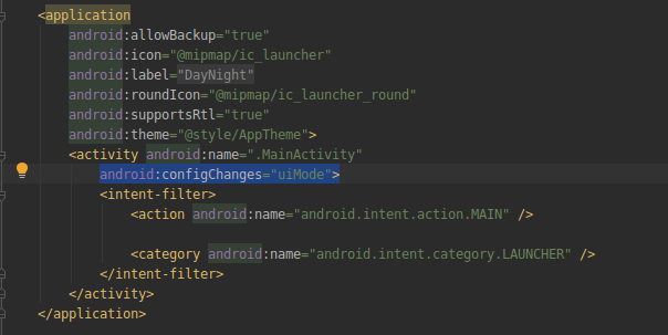 Dòng code này sẽ ngăn việc khởi tạo lại ứng dụng khi áp dụng darktheme theo cách thủ công hoặc từ thanh thông báo, vì vậy nếu bạn đã sử dụng color-night.xml, nó sẽ bị bỏ qua vì ứng dụng của bạn không được tạo lại.