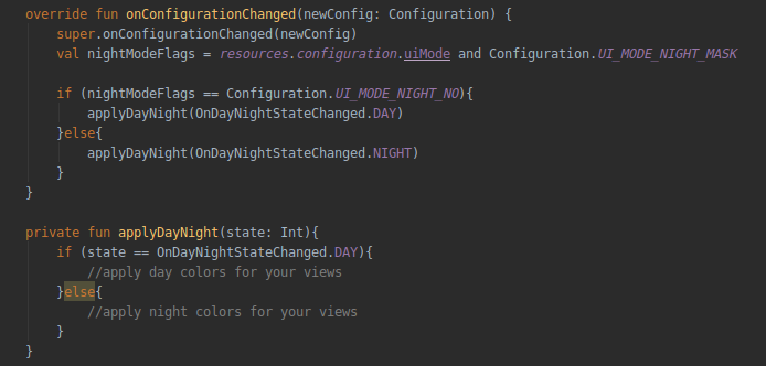 Sau đó, vào Activity và override lại hàm onConfigurationChanged và áp dụng màu dựa trên nightModeFlags