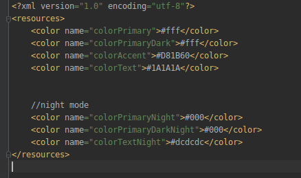 Ở đây mình sẽ tạo thêm các màu với tên "Night" ở cuối để phân biệt ở file colors.xml