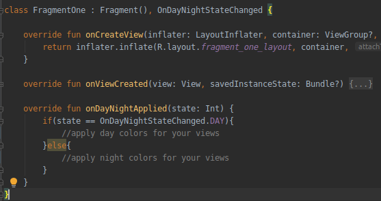 Và bạn phải notify Fragments sự kiện đó ở Activity, mỗi khi configuration thay đổi, fragment cũng sẽ nhận được trạng thái DayNight