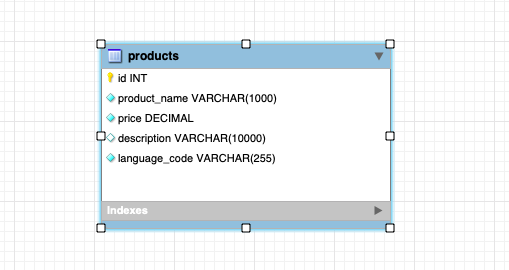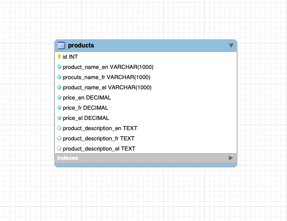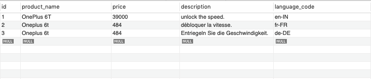 Các bạn có thể thấy tôi đã thêm các cột có format tên column_name_language_code. Products cần hỗ trợ name, price, description cho nhiều ngôn ngữ, vậy nên table sẽ có tất cả các trường đấy cho từng loại ngôn ngữ