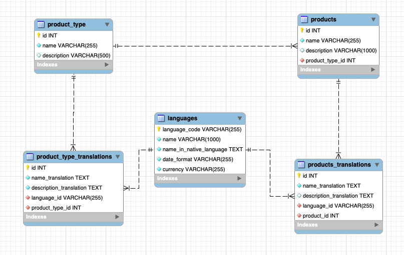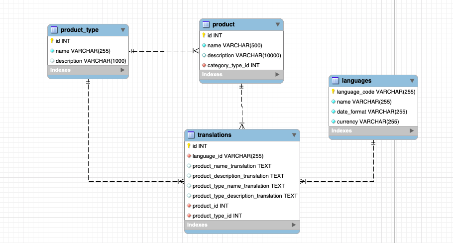 Ở cách này, chúng ta sẽ có một bảng translation cho tất cả các bảng trong database cần hỗ trợ I18n. Ví dụ với products và product_types: