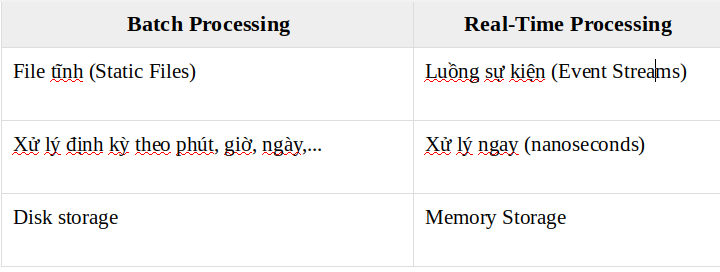 Bảng sau đây liệt kê sự khác biệt giữa Batch và Real-time Processing: