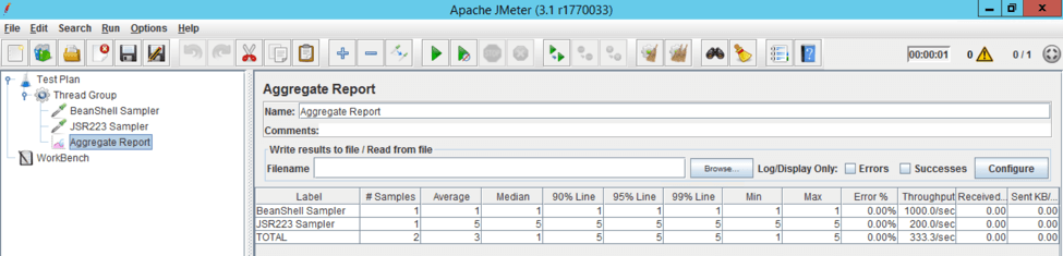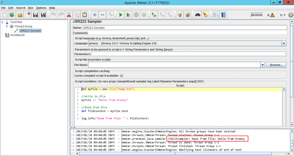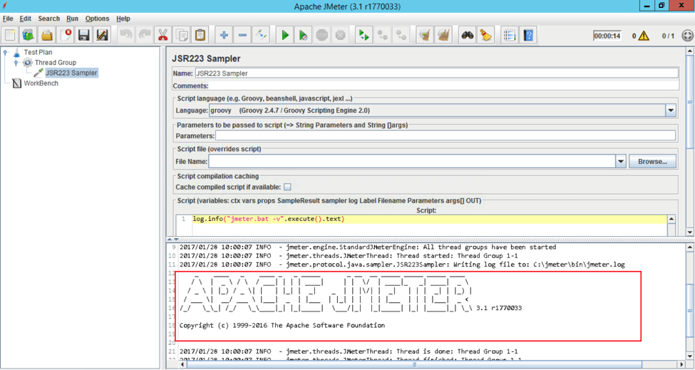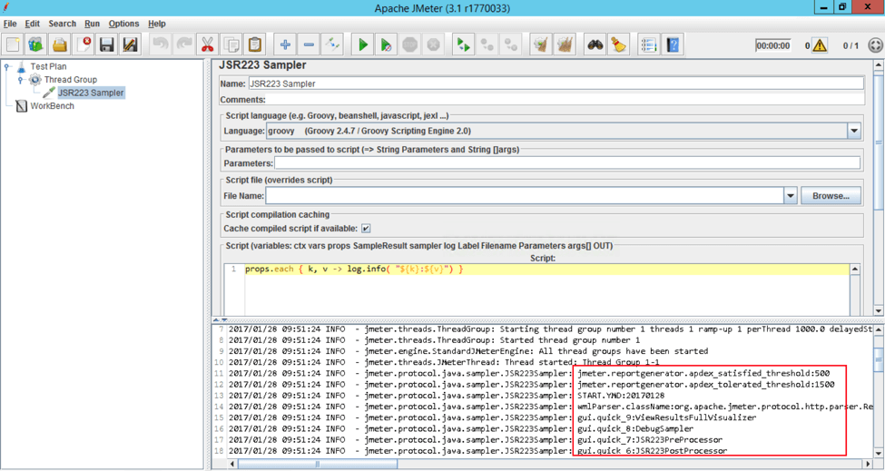 Hãy so sánh hiệu suất của các tập lệnh Groovy với các tập lệnh của Beanshell bằng cách thực hiện một cái gì đó rất cơ bản, chẳng hạn như in thời gian bắt đầu kiểm tra Jmeter( biến Jmeter có liên quan là TESTSTART.MS thành tệp jmeter.log).