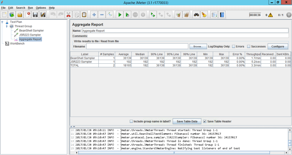 Bây giờ, chúng ta hãy kiểm thử một cái gì đó "nặng hơn", chẳng hạn như tính toán số thứ 36 trong dãy Fibonacci và in nó vào tệp jmeter.log bằng cách sử dụng Beanshell và Groovy.