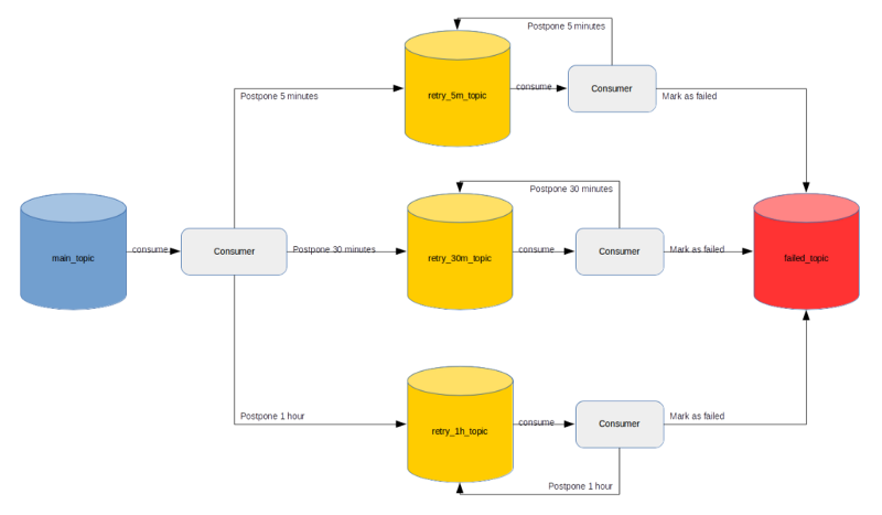Điều này có nghĩa rằng consumer ‘main_topic’ giao trách nhiệm của lỗi quá trình message cho thành phần (component) khác. Consumer ‘main_topic’ sẽ không bị nghẽn (blocked) và có thể tiếp nhận message tiếp theo. Consumer ‘retry_5m_topic’ sẽ nhận message tạo ra (published) bởi consumer ‘main_topic’ ngay lập tức. Nó sẽ đọc giá trị ‘retry_timestamp’ từ message và đợi tới khoảnh khắc (moment) đó, ngừng thread lại. Sau khi thread thức dậy, nó sẽ cố xử lý message một lần nữa. Nếu thành công, ta có thể xử lý message có sẵn (available) tiếp theo. Nếu không thì ta sẽ thử một lần nữa vì Retries Sequence có 6 thành phần và lần thử lại này là lần đầu tiên. Việc ta phải làm là sao chép (clone) lại message, tăng giá trị ‘attempt_number’ (sẽ là 2) và đặt ‘retry_timestamp’ giá trị bằng hiện tại + 5 phút (bởi vì giá trị thứ 2 trong Retries Sequence là 5m). Message đã sao chép sẽ được published vào ‘retry_5m_topic‘ một lần nữa. Bạn có thể để ý rằng mỗi thất bại của xử lý message, phiên bản sao chép của message sẽ được định hướng (routed) thới một trong các topic ‘retry_5m_topic’, ‘retry_30m_topic’ hoặc ‘retry_1h_topic’. Điều quan trọng là không được lẫn các message vào một topic với giá trị thuộc tính ‘retry_timestamp’ được tính toán khác về giá trị delay.