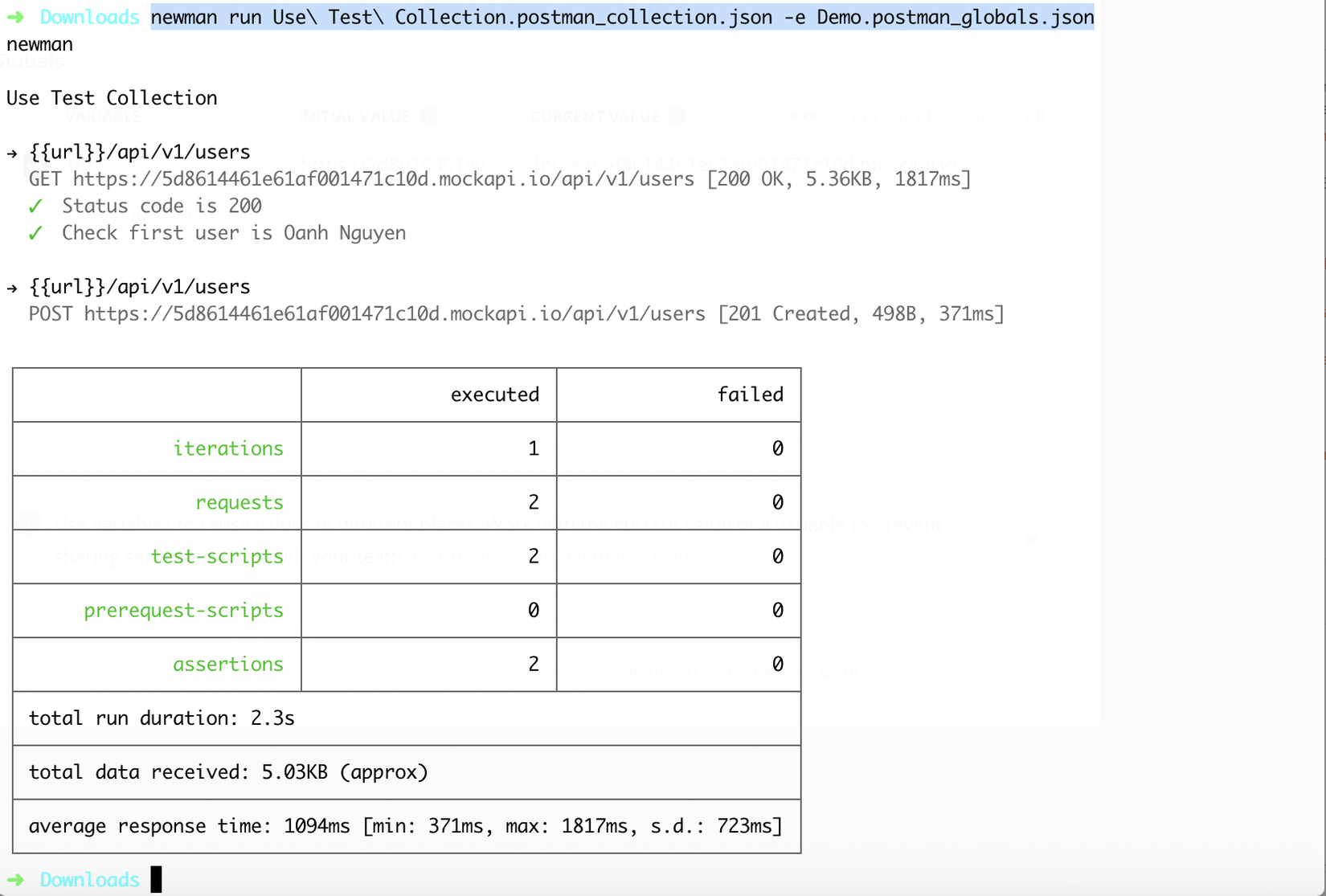 newman run Use\ Test\ Collection.postman_collection.json -e Demo.postman_globals.json