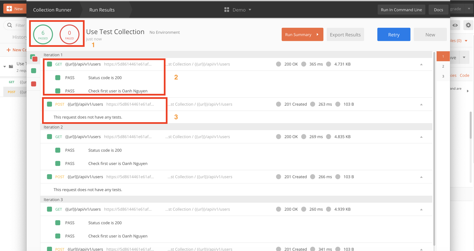 Ở đây, bạn có thể thấy được test trong request của bạn, có thể check xem HTTP request có thành công hay không và data đã được tạo hay trả về chưa.