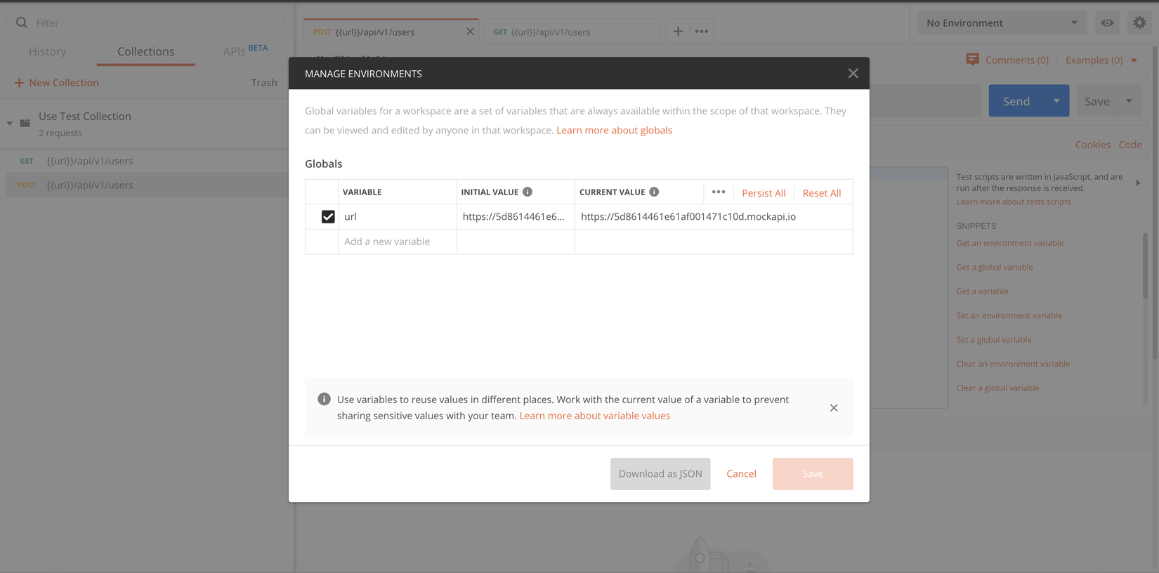 Bước 6) Chúng ta sẽ cần export environment. Click vào biểu tượng mắt bện cạnh environment dropdown trong Global, chọn Download as JSON. Chọn nơi lưu và click Save.