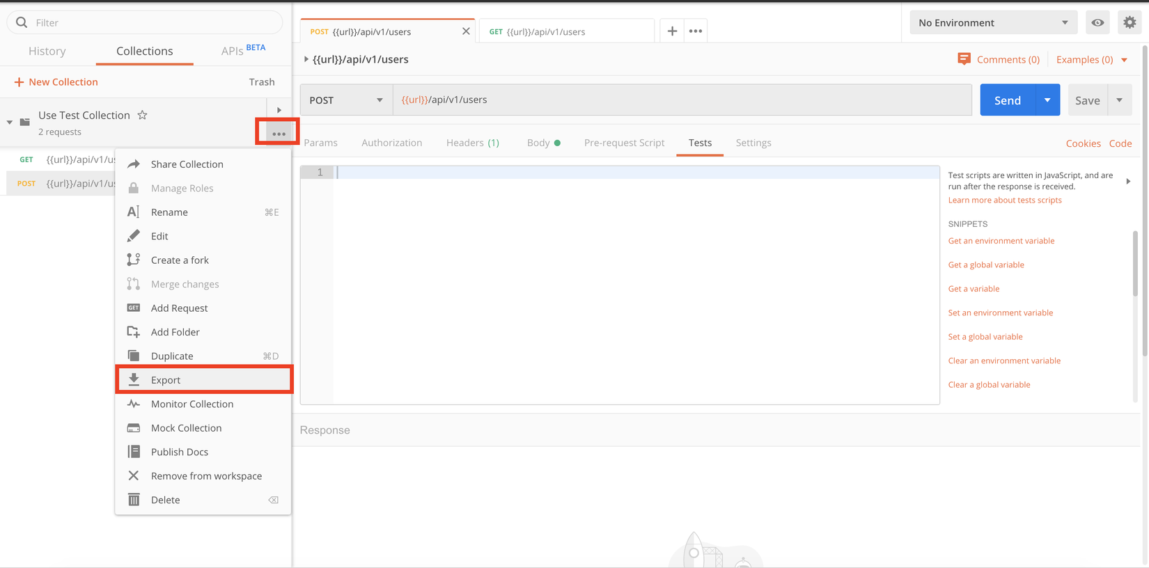 Bước 3) Khi nào Newman đã được cài đặt, hay trở lại Postman workspace. Trong Collections box, click vào dấu "...". Một popup sẽ xuất hiện. Chọn Export