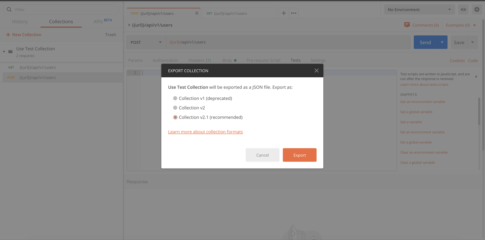 Bước 4) Chọn Export Collection như Collection v2.1 (recommended) tiếp theo click Export