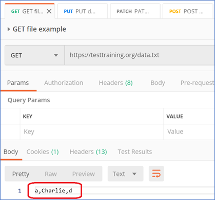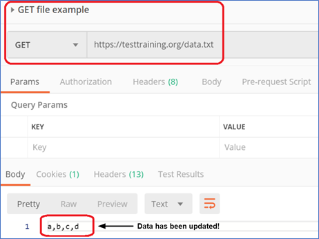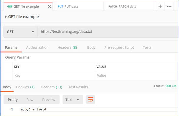 - Sau đó quay lại request trước đó của bạn ("GET file example") và gửi lại yêu cầu đó để xác minh rằng dữ liệu đã được cập nhật. Bây giờ nó sẽ hiển thị dữ liệu CSV mà bạn vừa gửi trong phản hồi: