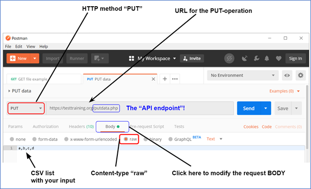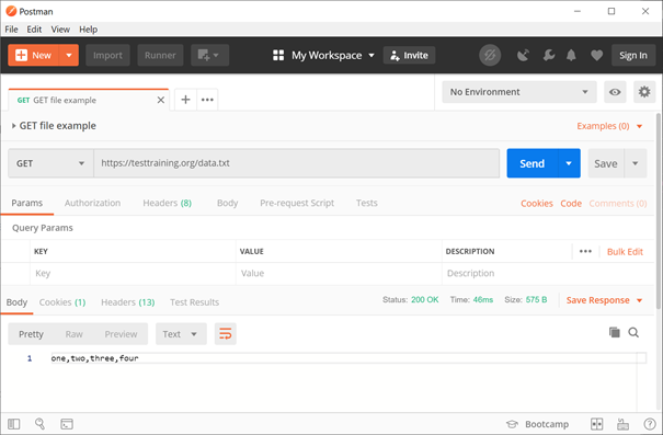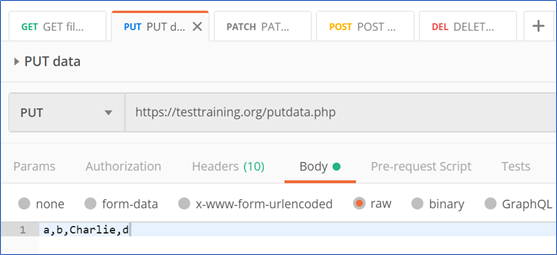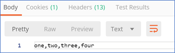 one,two,three,four- là danh sách bốn từ đó ở định dạng CSV. CSV là viết tắt của "comma-separated values" - các giá trị được phân tách bằng dấu phẩy. Nó được sử dụng để lưu trữ một danh sách các giá trị riêng lẻ, được phân tách bằng một dấu phẩy ở giữa chúng. - Vui lòng lưu trữ yêu cầu GET này trong collection của bạn dưới dạng: "GET file example", trước khi bạn chuyển sang yêu cầu PUT tiếp theo.