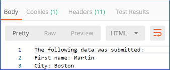 - Khi bạn gửi yêu cầu bằng cách click vào nút Send, nó sẽ hiển thị xác nhận trong phản hồi và trong ví dụ này, phản hồi cũng chứa dữ liệu đã gửi: