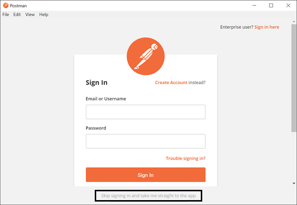 - Khi bạn cài đặt và chạy Postman, bạn sẽ thấy màn hình đăng nhập. Ở cuối trang, nhấp vào "Skip signing in and take me straight to the app". Nếu bạn không thấy nút để bỏ qua, bạn có thể đăng ký và đăng nhập