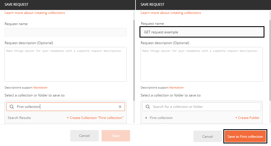 - Với lần thử nghiệm đầu tiên, hãy tạo ra một collection mới bằng cách nhấn vào nút “Create Collection” gần dưới cùng của cửa sổ Save Request và cung cấp cho nó một cái tên như “First Collection”