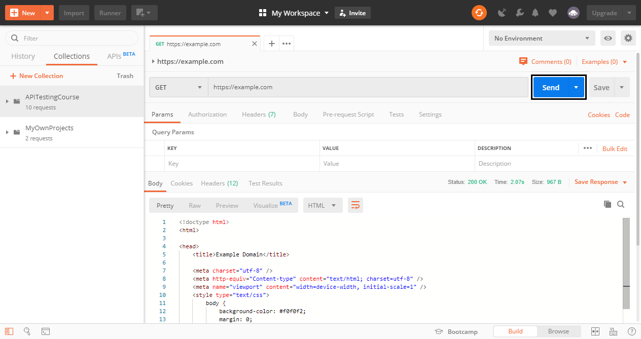 - Để yêu cầu nội dung của tệp văn bản đơn giản với Postman, chỉ cần nhập URL đầy đủ và click vào Send để gửi request.