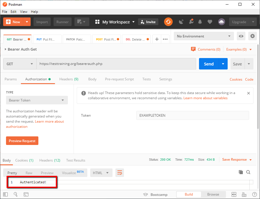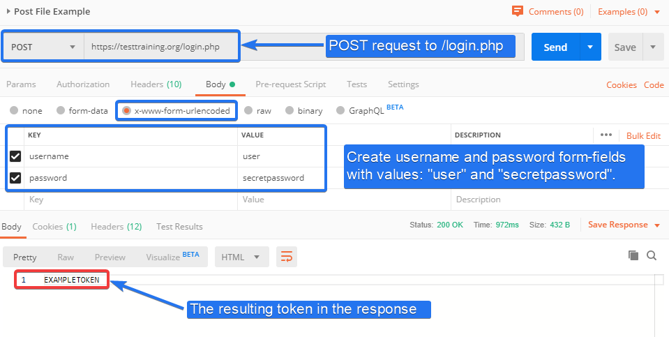 - Khi bạn nhấp vào Send, mã thông báo "EXAMPLETOKEN" sẽ được hiển thị trong phản hồi.