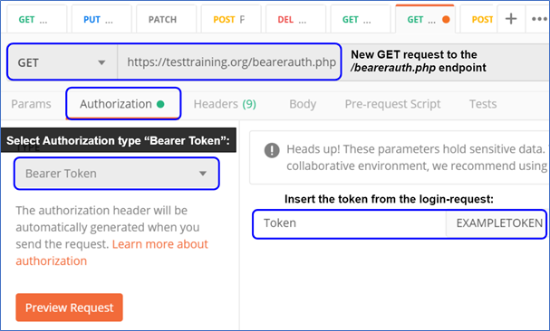 - Bearer Token khá giống với Auth cơ bản, ở chỗ nó sẽ được truyền dưới dạng tiêu đề yêu cầu. Nhưng thay vì "Authorization: Basic", nó sẽ sử dụng "Authorization: Bearer EXAMPLETOKEN"
