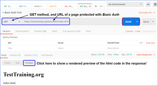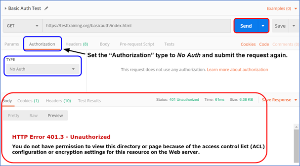 - Để xác minh rằng cấu hình ủy quyền đang hoạt động, hãy tắt Basic Auth và gửi lại yêu cầu vào cùng một trang