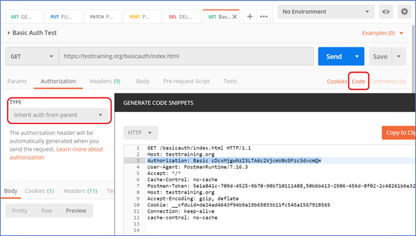 - Sau khi đặt loại Authorization trở về giá trị mặc định "Inherit auth from parent", nhìn vào mã bạn có thể thấy phương thức xác thực này hoạt động bằng cách gửi tiêu đề yêu cầu mới có chứa tên người dùng và mật khẩu ở dạng được mã hóa Base64: