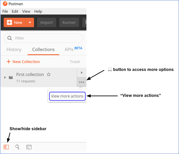- Khi bạn mở sidebar trong Postman và di con trỏ qua bộ sưu tập đã lưu, một nút "..." mới sẽ xuất hiện với quyền truy cập vào cài đặt Bộ sưu tập: