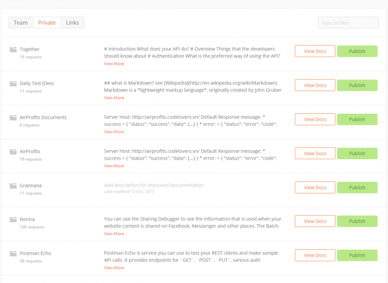 Click vào View Docs để xem API Docs (đây là link của trạng thái Private, link này không share được).