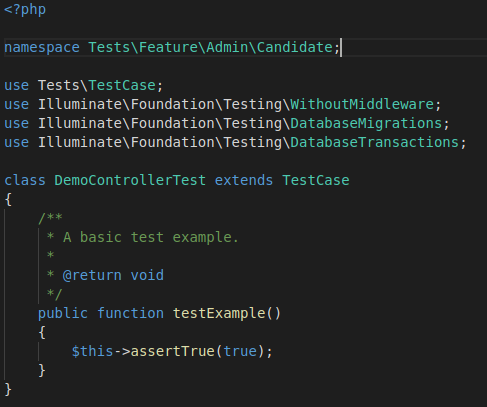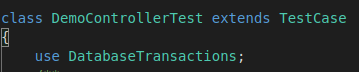 Trước hết chúng ta sẽ thực hiện use DatabaseTransactions; vào đã. Mục đích là để sau khi thực hiện chạy test, dữ liệu trong database sẽ được revert về như ban đầu.