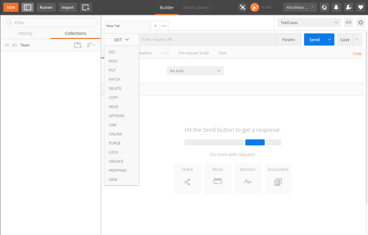 Request methods Như hình ở trên, postman cung cấp cho chúng ta khá là nhiều phương thức. Trong số đó POST, PUT, GET, DELETE là 4 phương thức mà chúng ta thường sử dụng: