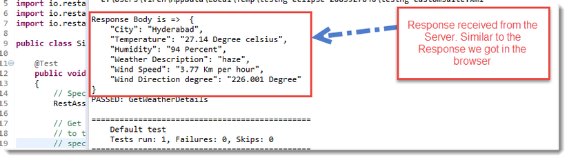 Response response = httpRequest.request(Method.GET, "/Hyderabad");